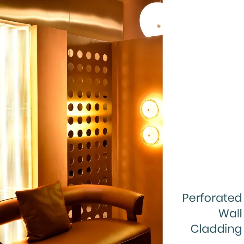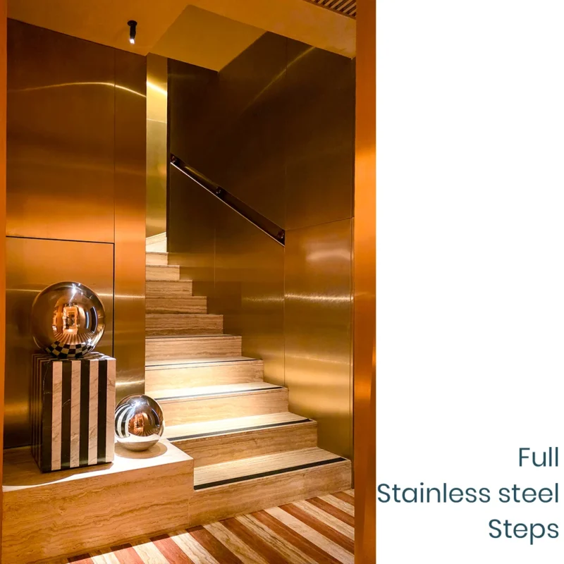 The custom wall cladding, featuring precision-perforated holes, beautifully transforms solid metal into a functional design element. These calculated openings not only provide an engaging visual texture but also ensure discreet privacy for guests, allowing light and ambiance to flow while maintaining an exclusive feel—a perfect blend of luxury and functional seclusion achieved through intelligent custom metal fabrication. This expertise extends structurally: we were also entrusted with delivering a complete stainless steel staircase. This bespoke structure, designed for heavy commercial use, showcases our mastery of architectural stainless steel fabrication, guaranteeing superior structural integrity alongside a flawless, high-end finish.