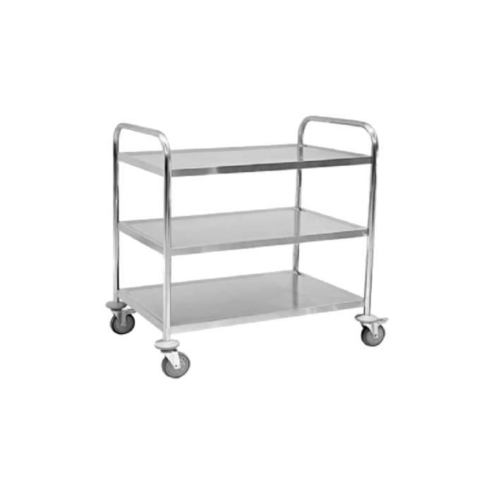 . 3 shelves. . total capacity: 80 kg. . top: 1.2 mm thick. . ant-noise and satined shelves multidirectional wheels. . rubber buffer. . dim: 840 x 500 x 970 mm.